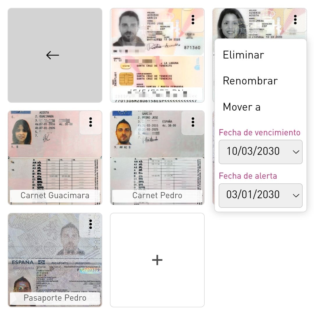 Puedes crear carpetas personalizadas y almacenar todo de forma ordenada, incluso asignando fechas de renovación o alertas para los documentos importantes que necesitan estar al día.