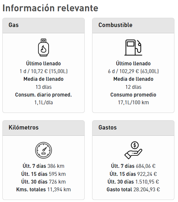 Además, encontrarás datos clave como la última vez que rellenaste gas/GLP o combustible, junto con una estimación de cuánto queda disponible. También verás un resumen de los gastos y kilómetros realizados en los últimos 7, 15 o 30 días, así como el total acumulado.