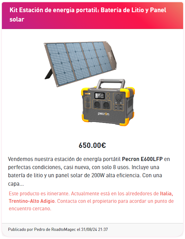 Lo que hace único a este marketplace es que está pensando para usuarios con este estilo de vida a traves de la opción de ubicación itinerante. Los productos pueden actualizar automáticamente su ubicación conforme el propietario recorre su ruta planificada. De esta manera, el artículo estará disponible en cada punto del viaje, facilitando las transacciones entre viajeros en movimiento. Aunque también se puede indicar una ubicacion fija si se prefiere.