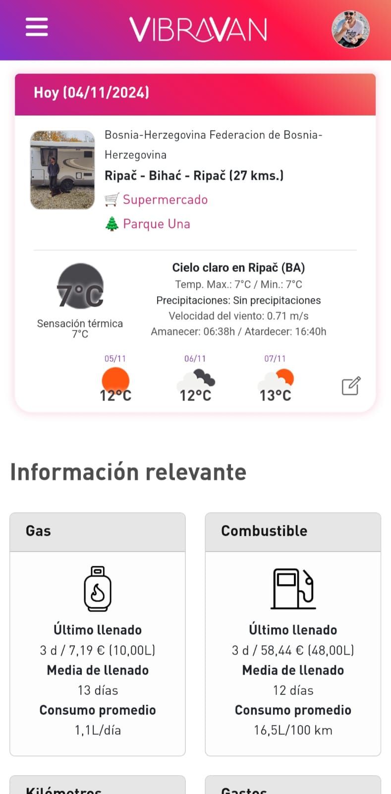 Añade tus puntos clave, como áreas de descanso, supermercados, actividades, sitios de pernocta... y lleva el control de los kilómetros realizados. Guarda fotos y notas para cada día, ayudándote a recordar cada momento especial, y consulta la previsión del clima de cada lugar.